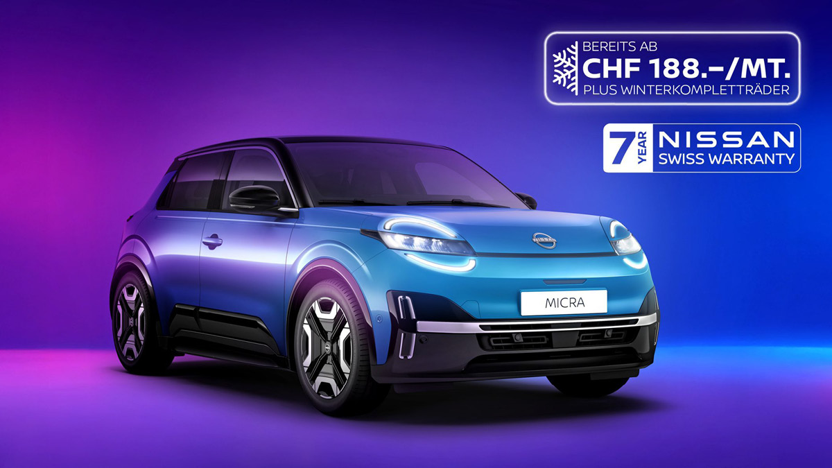 Schon ab CHF 188.– pro Monat erhältlich – inklusive 7 Jahre Nissan Swiss Warranty plus Winterkompletträdern.